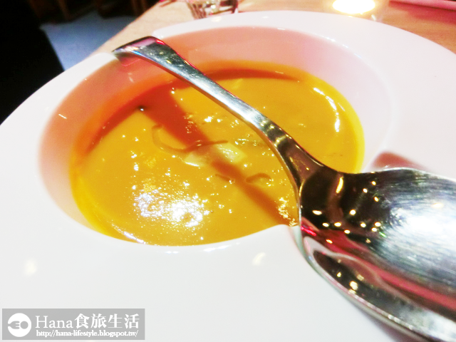 湯是新鮮橘黃色的南瓜濃湯~很喜歡他們盛裝的瓷器,