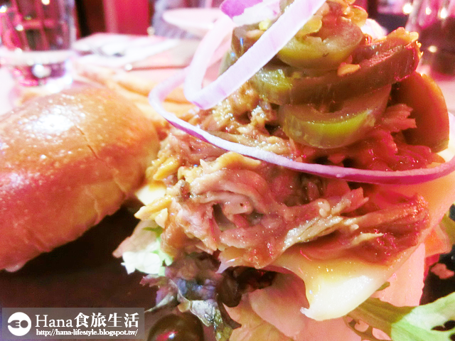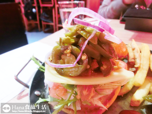 ▲豬肉漢堡的餡料堆得高高的,除了有生菜、番茄片、洋蔥和起司片外,