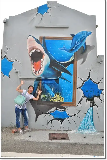 車子停好就可以下來走走晃晃了,我們一下車就看到了這面彩繪牆,目光馬上被超立體生動的畫被