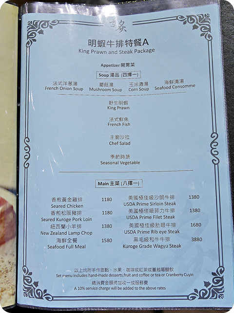 這次來品嚐的兩款套餐其中一種是明蝦牛排A餐,除了開胃菜、湯品、野生明蝦、法式鮮魚、沙拉