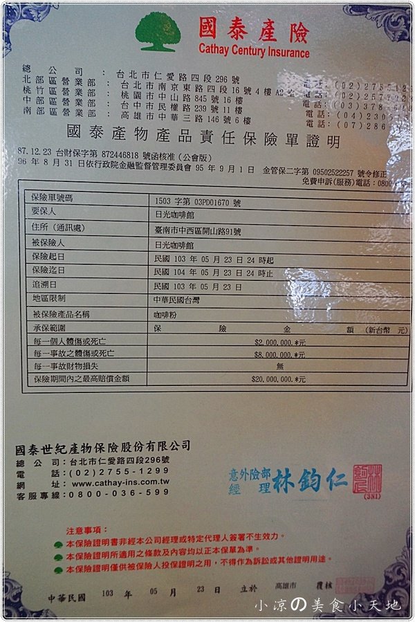 日光咖啡還為了自己的咖啡投保呢...品質有保障