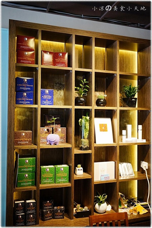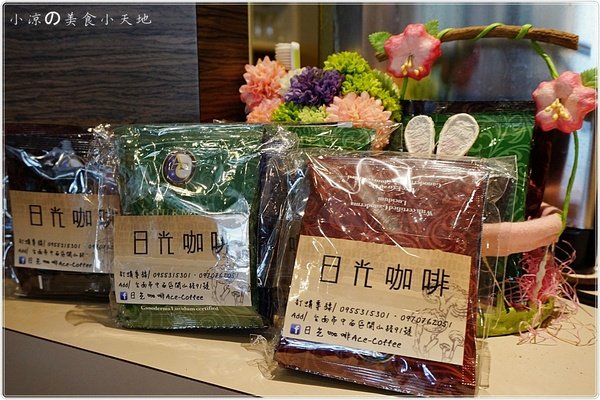 一旁的櫃子上,擺放了日光咖啡的相關產品等等...