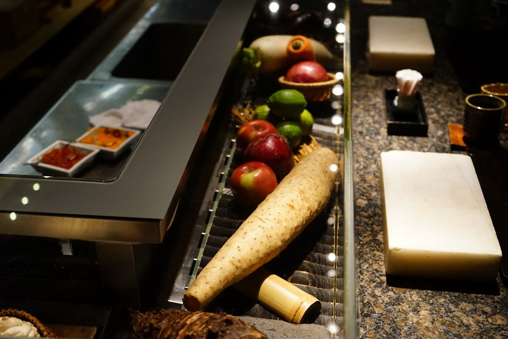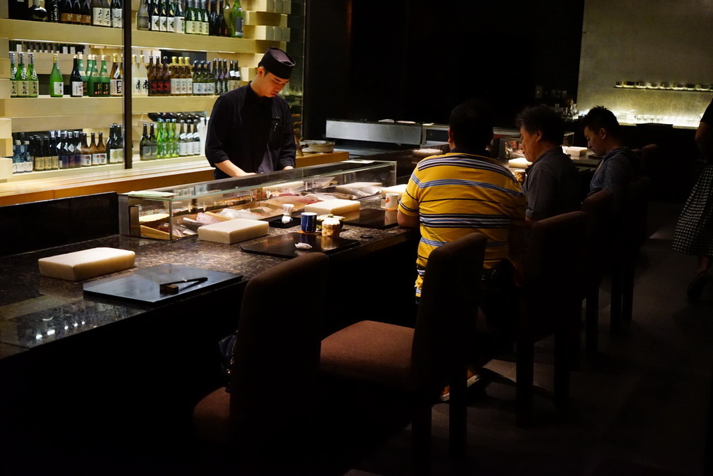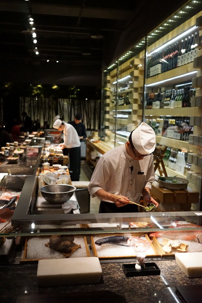 板前後方陳列了很多酒,右邊是日本酒,左邊是紅酒,而且是不少頂級酒。