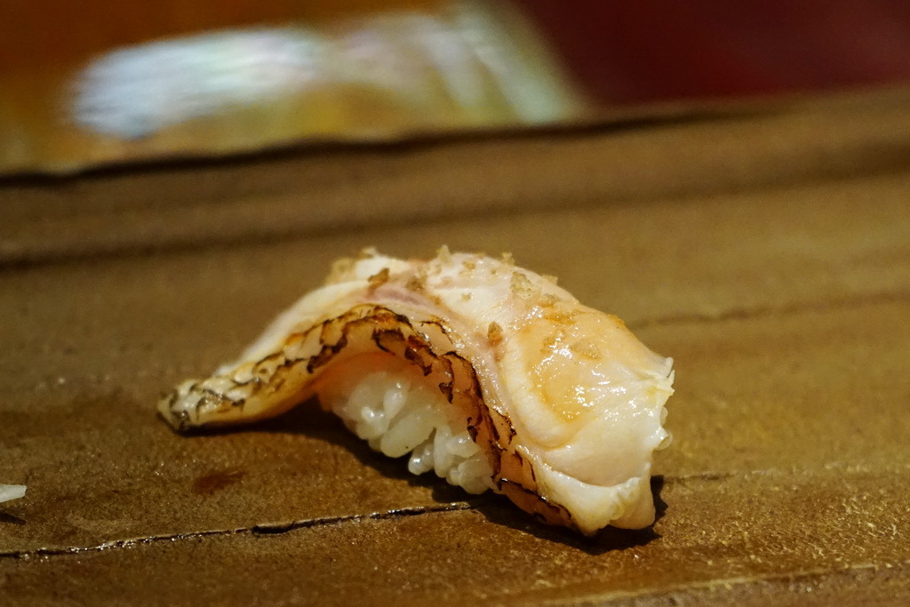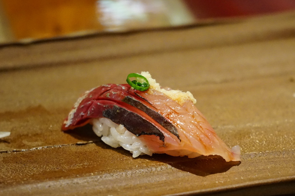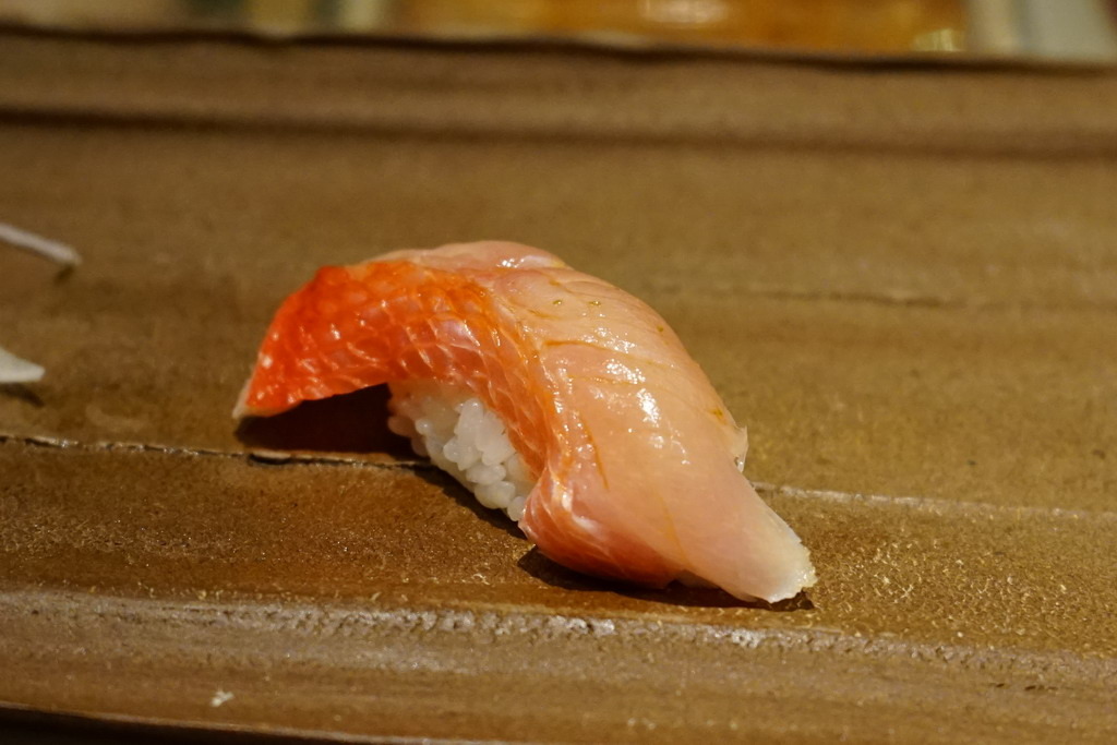 金目鯛握壽司,多年前聽聞"夢幻魚"的別稱,一到年冬初春之際,在宜蘭南方澳是當季的魚種,幾乎每個餐廳都會以這種魚為主,除了顏色喜氣之外,肉質絕美,無論是生食熟食都無可挑剔