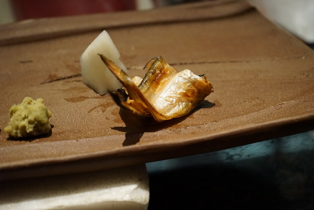 時令的醃漬物,有點酸酸脆脆,桃子味因為脫水香氣更濃郁,在等一下品嚐油更高的魚肉時,可以平衡一下口腔。