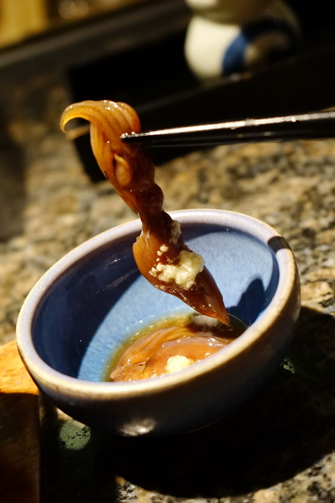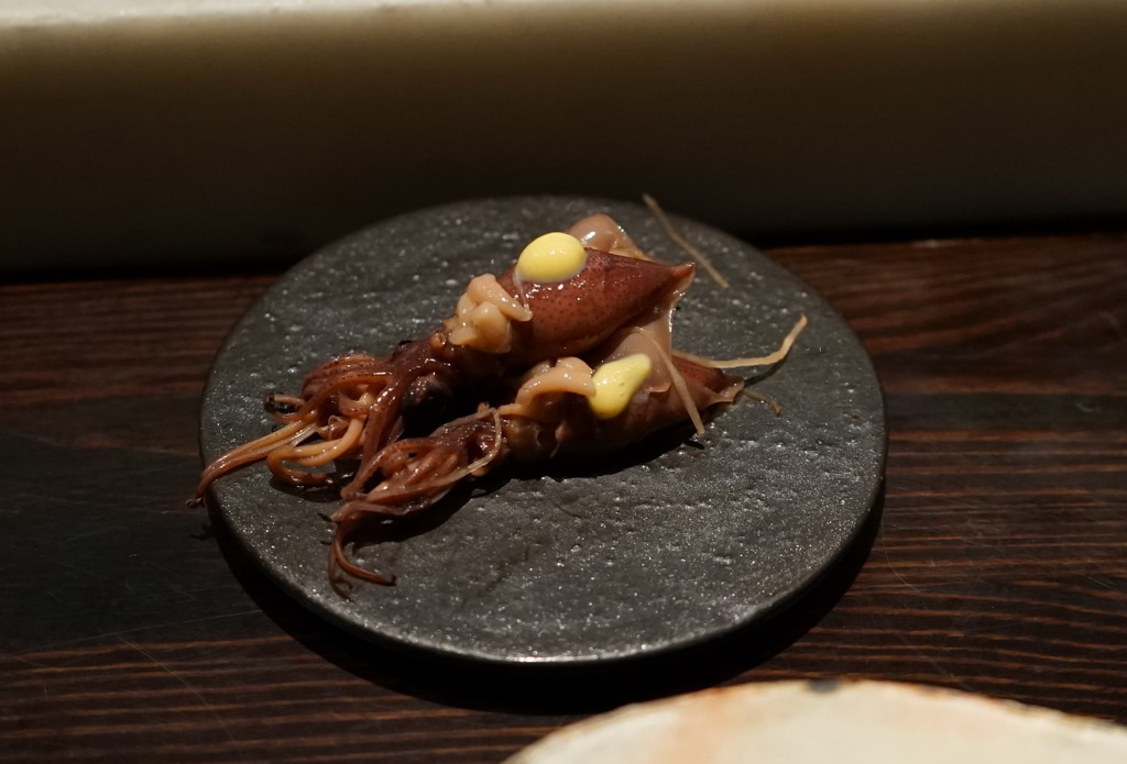 這是鹽漬的螢烏賊,有點像是客家人醃漬的"給"或是原住民醃的生肉。果然每個飲食所表現出來的是文化的延伸,一群人在一個地方,說同樣的語言,吃同樣的食物,這就是文化。其實日本料理從來就沒有特別高尚,只是我們把它想高貴了。