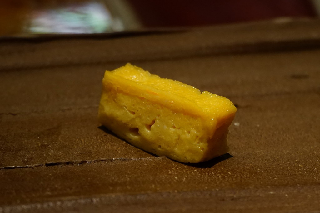 玉子燒,板前料理長說,早期日本江戶前,沒有甜點,所以都會用帶甜甜的玉子燒做為結尾,而在享用板前壽司,只要看到玉子燒,就是告訴你,今天的餐點結束了,