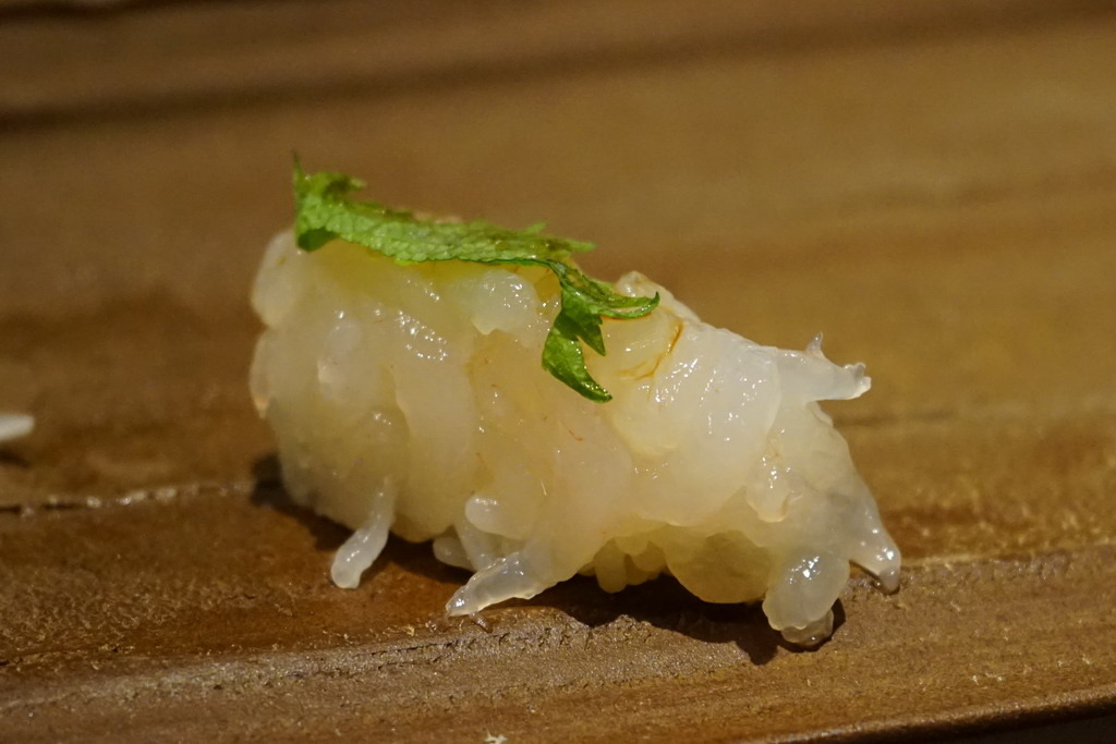 富山灣白蝦握壽司,小小透明的身軀,重疊後會看出淡淡的粉紅色,被稱為「富山灣的寶石」。漁期為4~11月。日本只有富山灣有專門捕白蝦。多用於生魚片或油炸料理。說來慚愧,常吃日本料理,我們竟然是第一次接觸到這種食材,被白蝦的甜度閃到,濃郁的甜度比任何一種蝦子都還要來的讓人驚艷。現在我又愛上了白蝦,除了海膽、軟絲、鮭魚卵之外