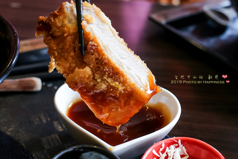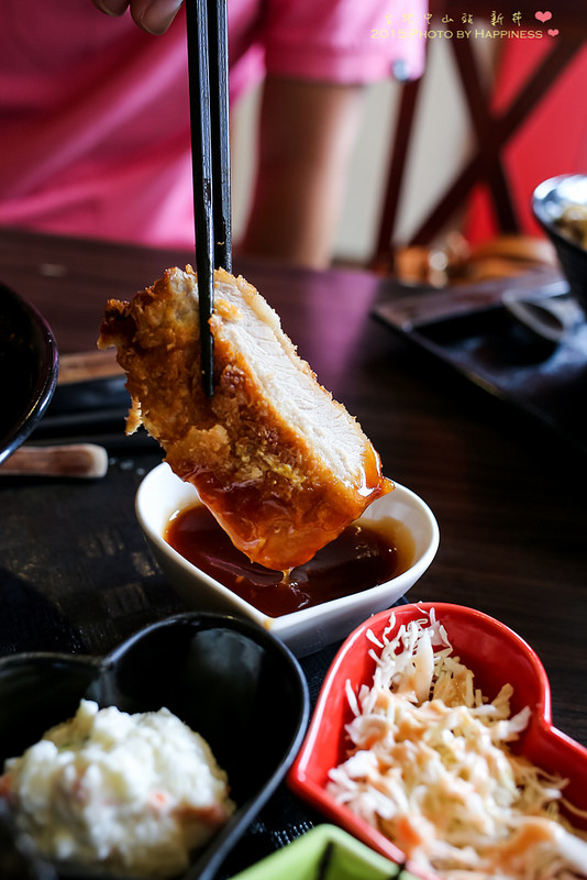 ▲▲▲夾起一片厚厚豬排,沾上旁邊的豬排沾醬準備入口
