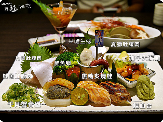 主角就是這盤了拉!我一看到干貝蟹膏堡我就流口水了,後方還有加拿大海膽,三大片魚腹肉、鮭魚卵、