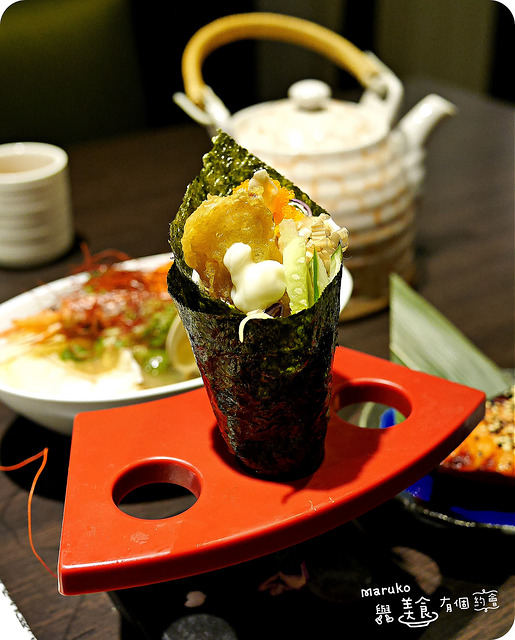 這款手卷可是一上桌就要馬上品嚐,才能吃到脆脆的海苔香,基底是高麗菜絲、小黃瓜、柴魚、