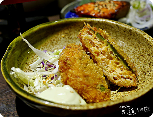 這一款也是菜單上沒有的料理,只用了紫蘇葉與鮭魚肉下去油炸,沾上日式美奶滋,還蠻特別的,而炸過