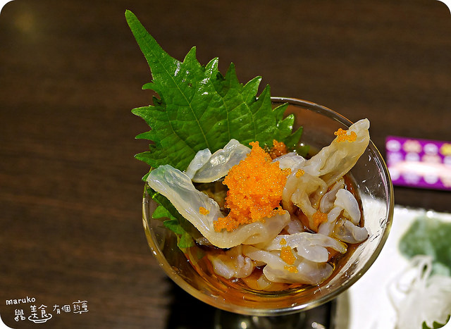 帶有一點透明感的水母皮搭配上果醋與蝦卵,吃起來有一點冰涼又脆脆的,其實水母皮本身沒有