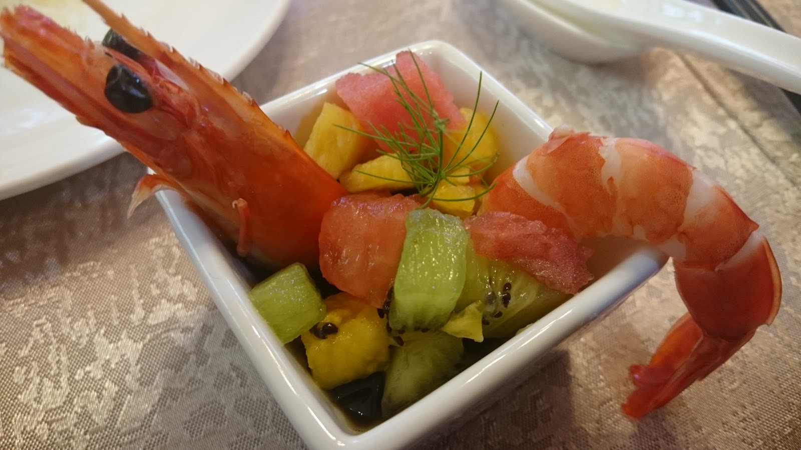 ▲這道前菜鮮蝦水果超消暑,搭配著夏季水果,番茄、奇異果、鳳梨,蝦肉紮實又Q彈跟水果搭配著吃多股酸甜味最底下又搭配著酸梅果凍,整個食慾都提升起來了。