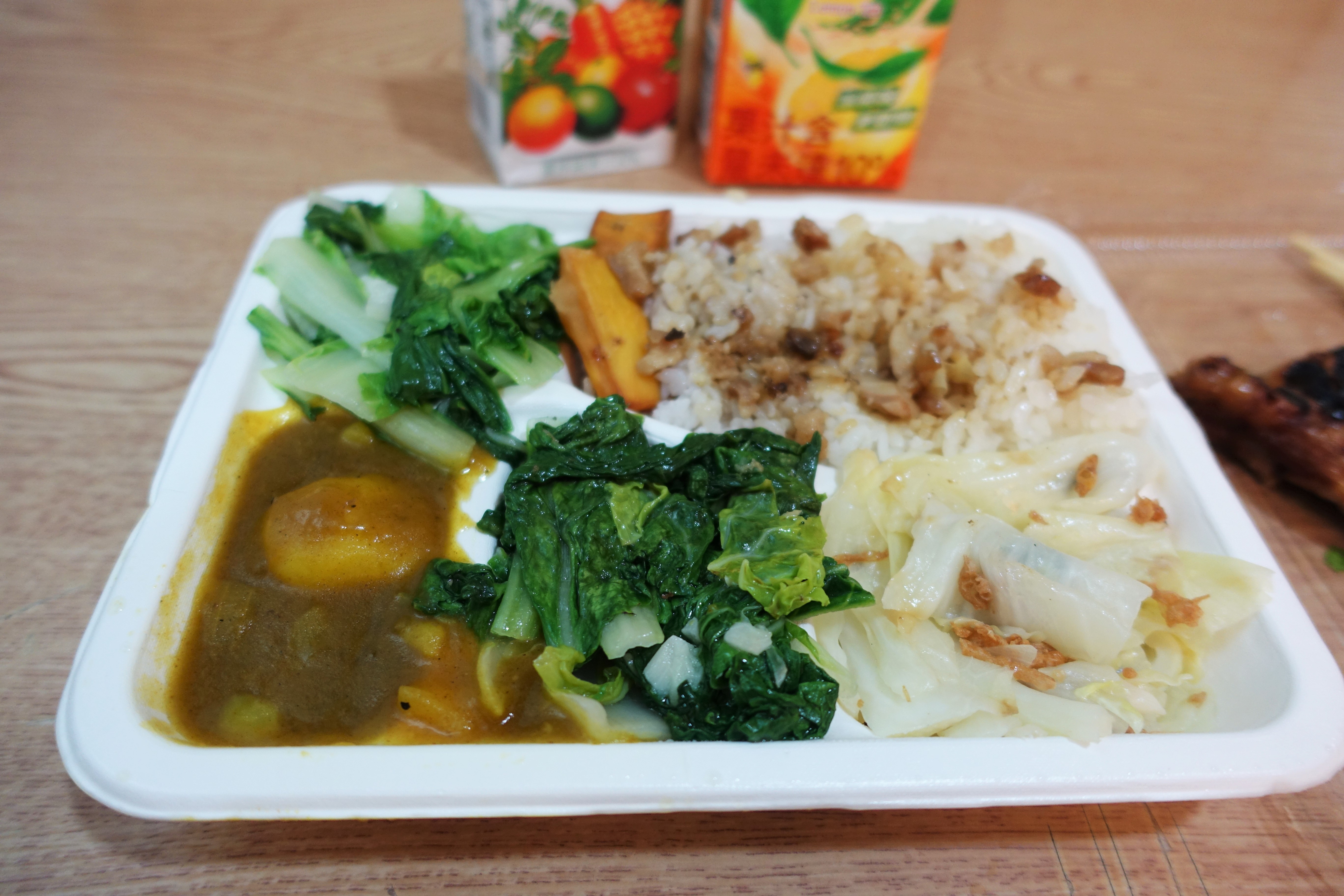 外帶便當會有四樣配菜,但因為我在營業前15分鐘就跑進去點餐,店家才剛準備好兩道配菜而已,所以哥的便當才會有兩格配菜一樣。
