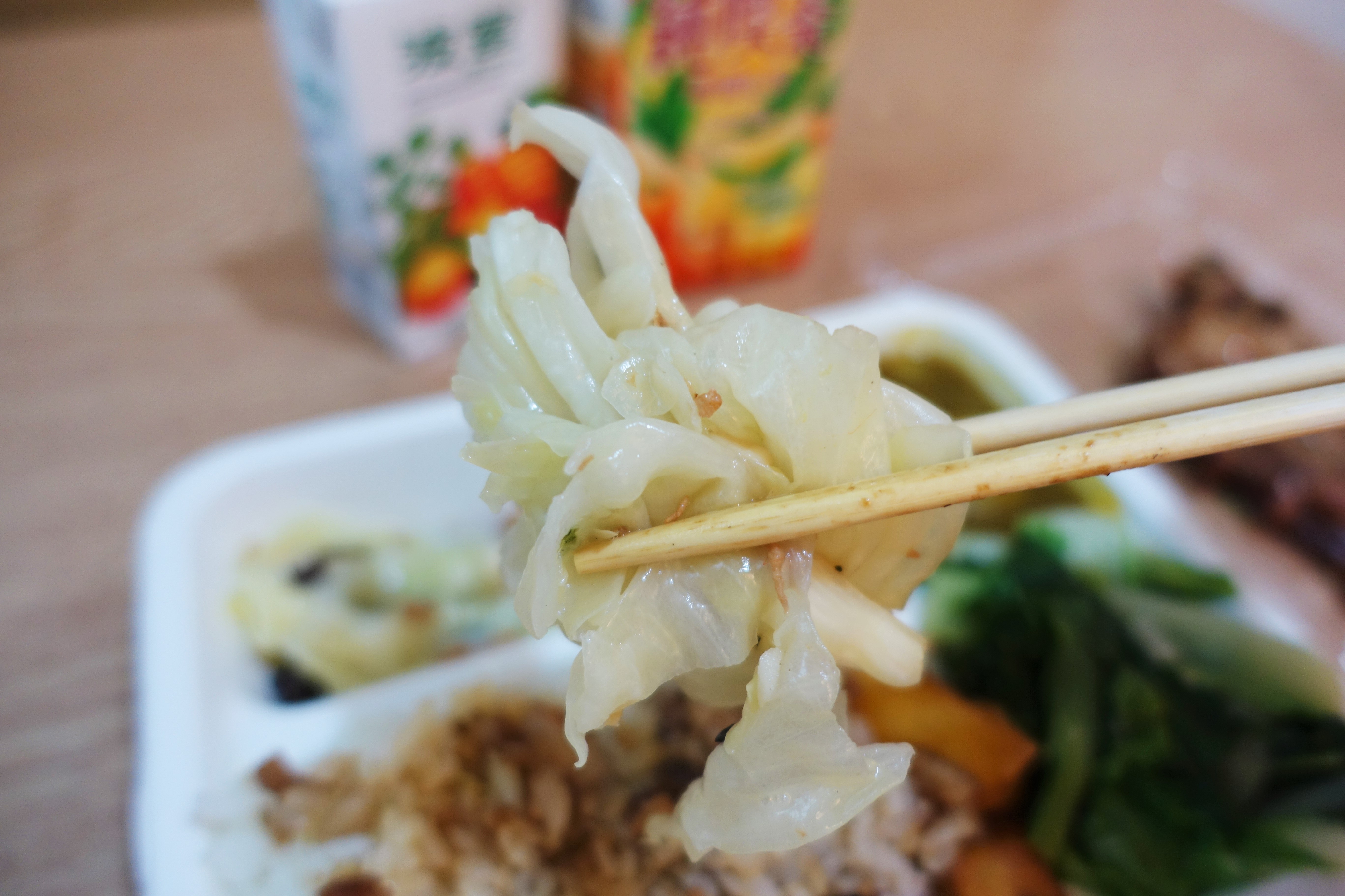 高麗菜沒有過多的調味料味道,而是與木耳、蝦米與豆皮下去炒,可以吃到豐富的食材原味。