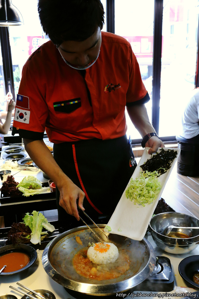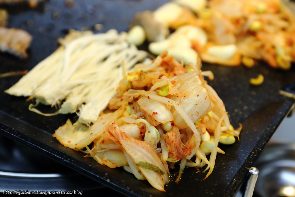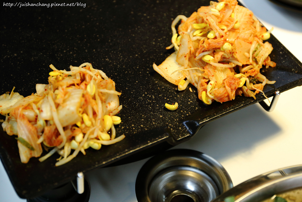 在八色烤肉還沒上桌之前,服務人員就會先把泡菜豆芽,放到鐵板上烤熱。