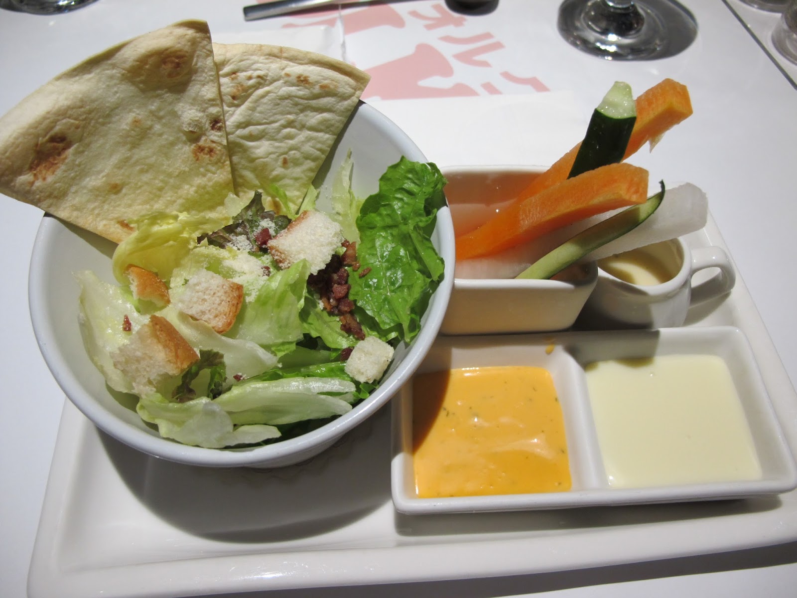 第一道沙拉,包含了凱薩沙拉與鮮蔬棒,葉菜類的沙拉鮮度非常好,蔬菜含著飽滿的水分,相當甜脆,醬汁另附在旁邊的小杯中,可以酌量添加;鮮蔬棒相當清脆,可選擇沾著千島或優格兩種醬料,吃起來很爽口!