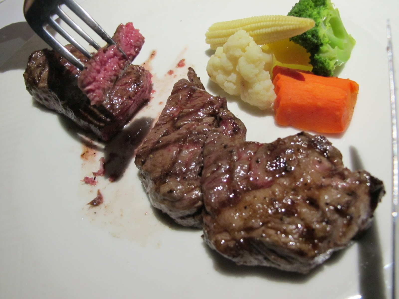 嫩肩牛排建議7分熟,但剛上桌時覺得大概是5分熟,因此又回煎一次,這才滿意的開動,廚師的火候控制得很好,牛排口感仍然很嫩,雖然沒法跟菲力相比,但嫩肩牛排的肉質也算不錯!大家可以從嫩肩入手,應該也能吃得心滿意足而歸。