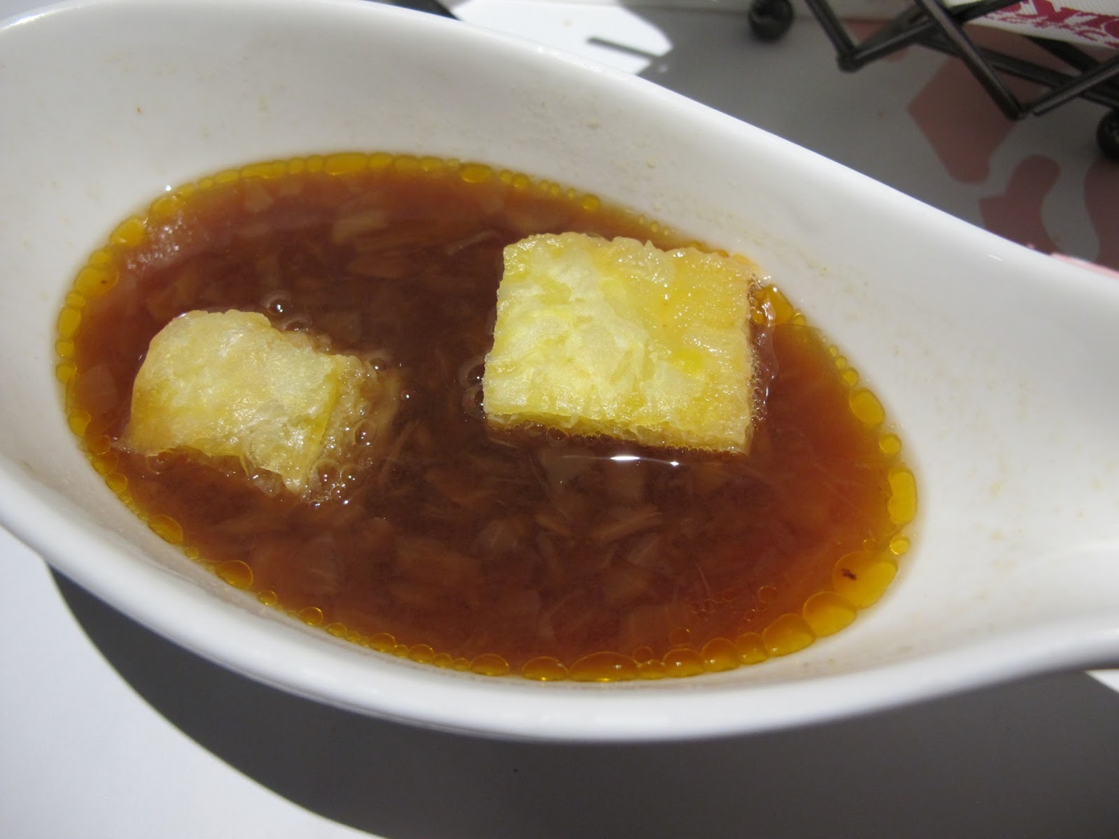 洋蔥湯嚐起來清爽鮮甜,熱呼呼的湯上頭綴著兩塊烤過的酥皮,喝的時候酥皮稍為吸收了湯汁,吃起來很香嫩!有驚喜感!又不會像酥皮濃湯那樣一大塊吃起來負擔很大!