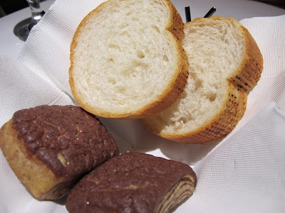 麵包有兩款,法國麵包切片及巧克力甜麵包,口感普通,法國麵包可以塗上奶油抹醬使用,比較不覺得乾硬,巧克力甜麵包也有點乾癟。