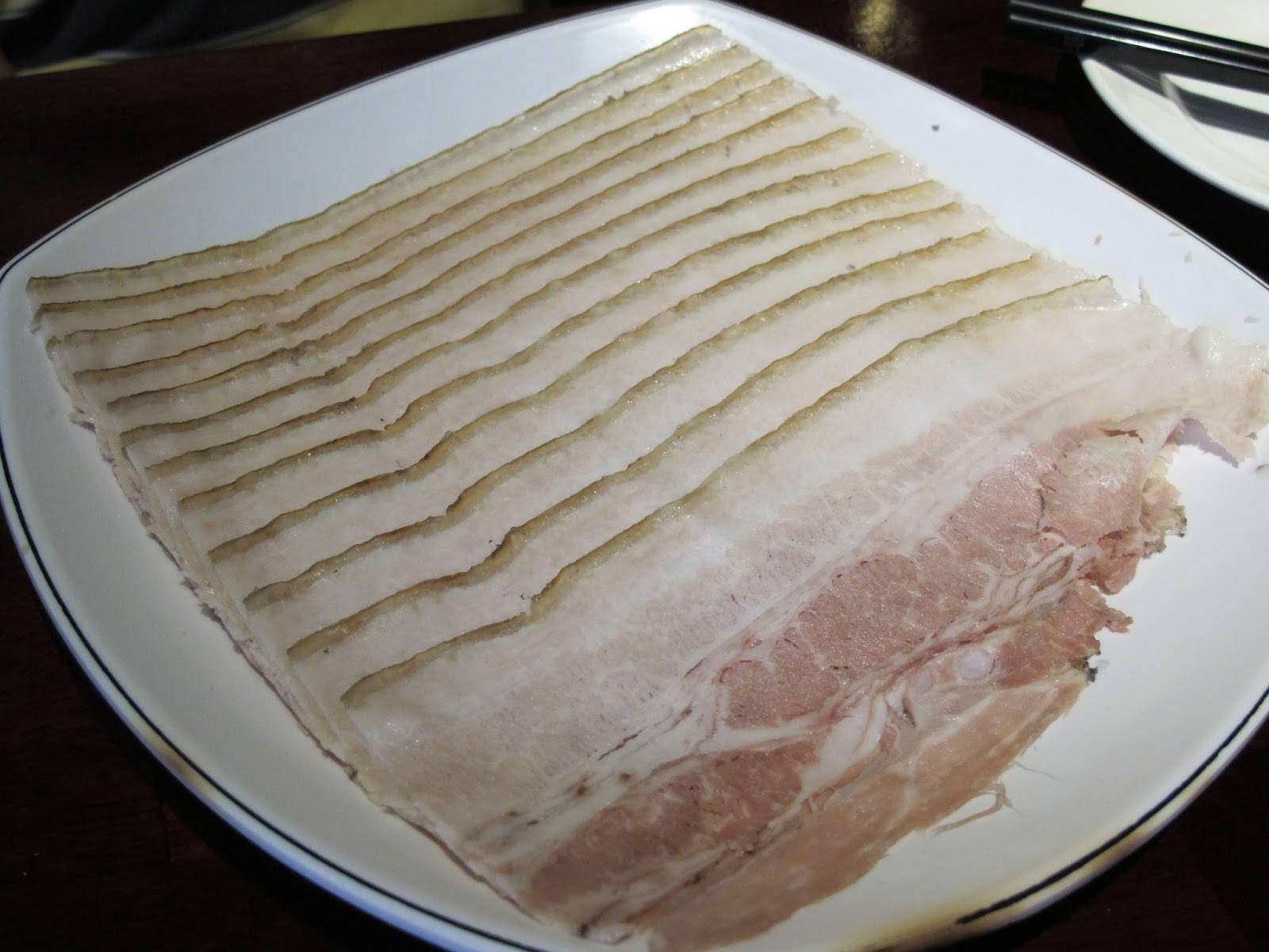 酸菜白肉鍋湯底中已經有一些五花肉片在裡面,另外可以點這盤招牌三層肉,上桌就已經是煮熟的狀態,面積很大的五花肉,片得薄薄的,油脂吃起來一點都不膩,放進鍋底涮幾秒鐘,就可以吃了!大塊的五花肉摺疊捲起來吃,層次分明,吸收了酸白菜鍋的湯汁,讓豬肉片吃起來美味極了!