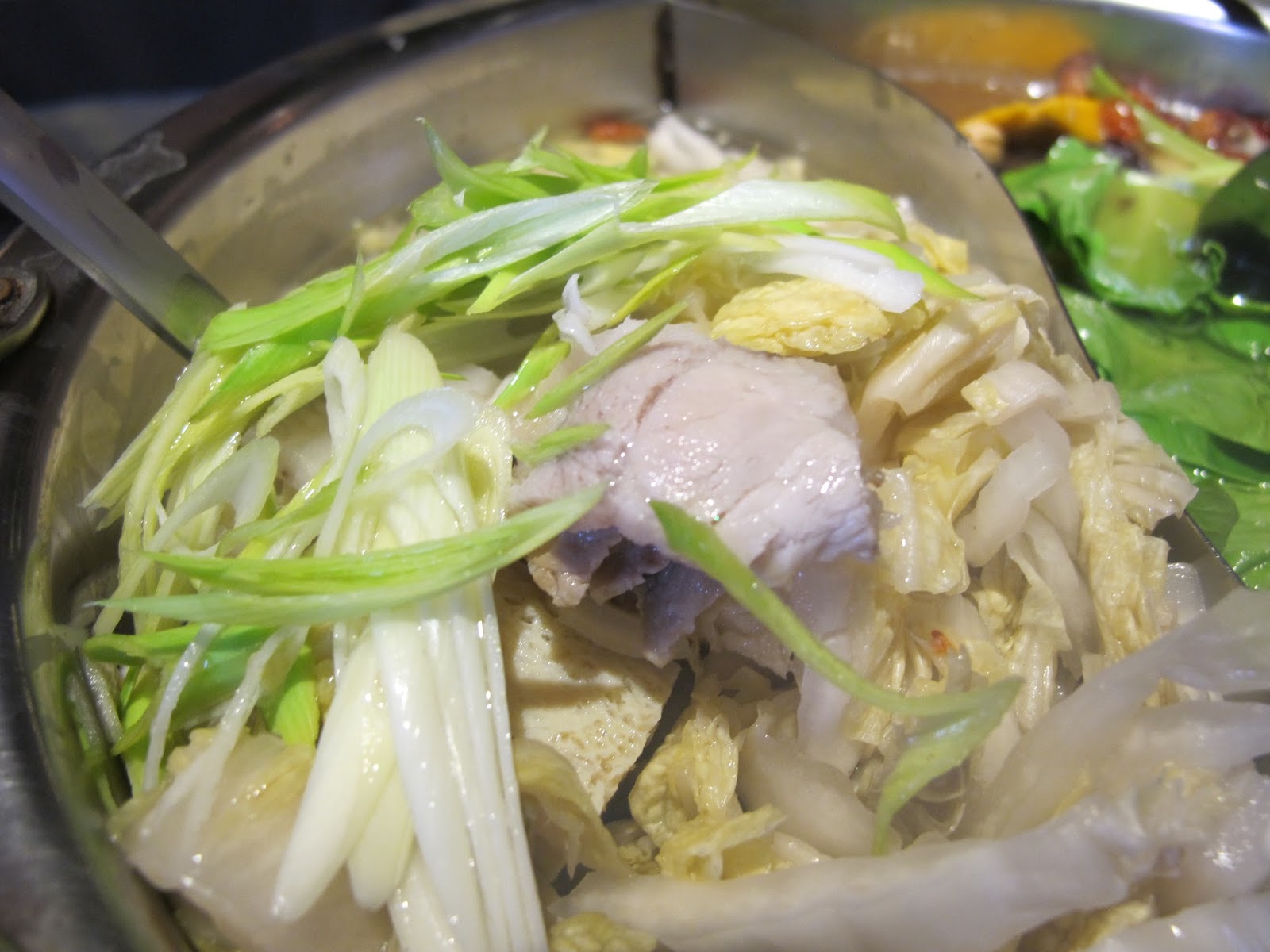 忍不住舀起湯底,酸菜白肉鍋這邊,裡面滿滿的酸白菜、青蒜、豬肉與凍豆腐,好新鮮啊!酸白菜的酸度很好,咬起來有脆度,伴著豬肉入口,豬肉非常美味!