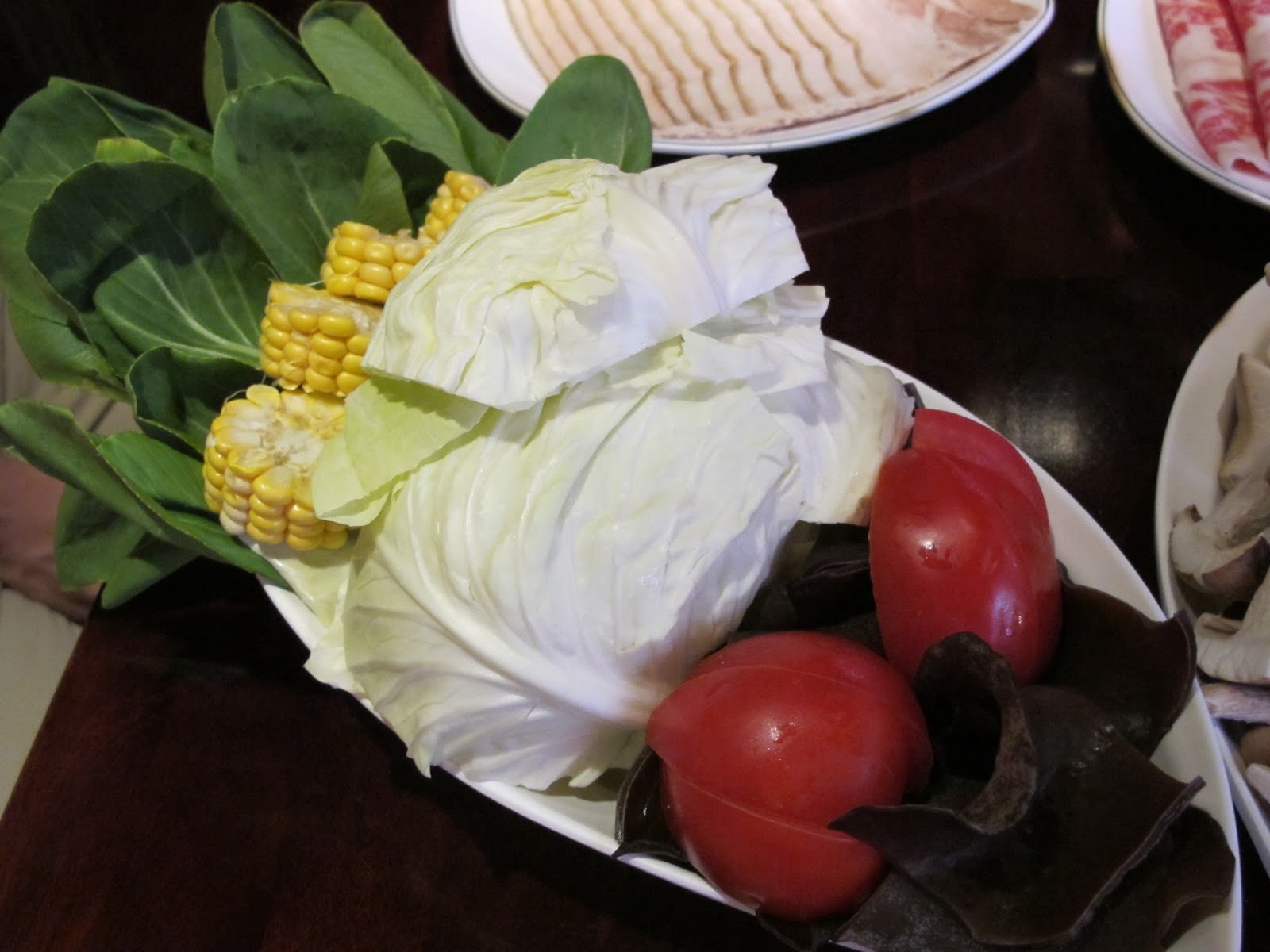 蔬菜盤裡除了常見的蔬菜與玉米,最養生的是還準備了很多大片的黑木耳、番茄塊。