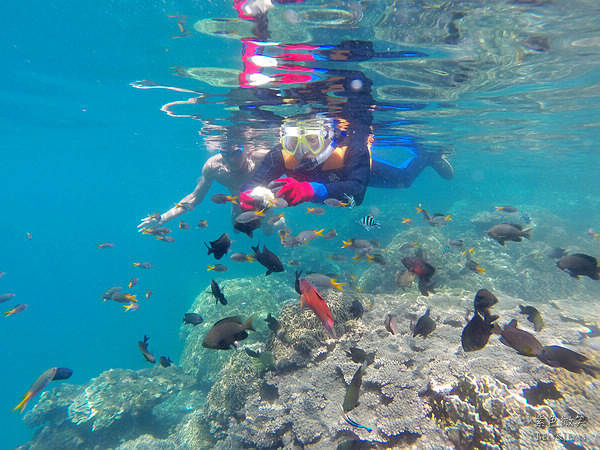 飯店人員也會安排麵包讓遊客餵魚,這裏的魚群種類不少!!! 不用遠赴綠島或其他海島國家,就可以享有在海中悠遊自在與魚兒共遊的樂趣。來玩的時候因為潮汐的關係,水面比較低,真的快碰觸到珊瑚礁了,還好浮水背心的浮力非常OK,所以實際上還碰不到