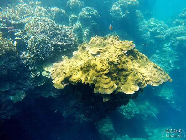 剛剛的水中推進器上場了,由教練抱著它前進,後方人員拉著他的腳踝就可以輕鬆往前了,非常方便,幾乎完全不用力氣,而且離岸邊沒多久就看到下方有珊瑚礁群了,難以相信距離這麼近吧