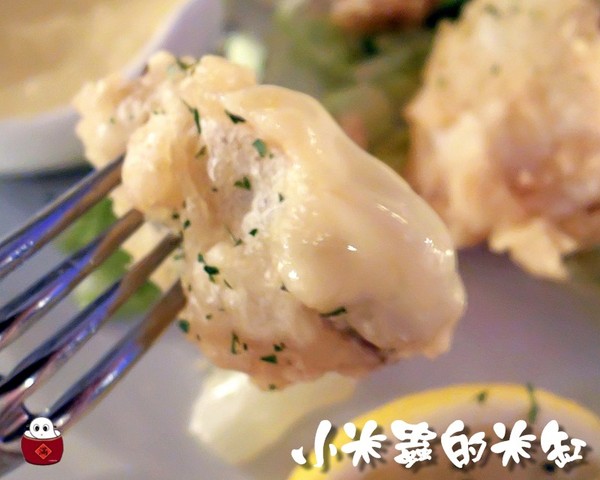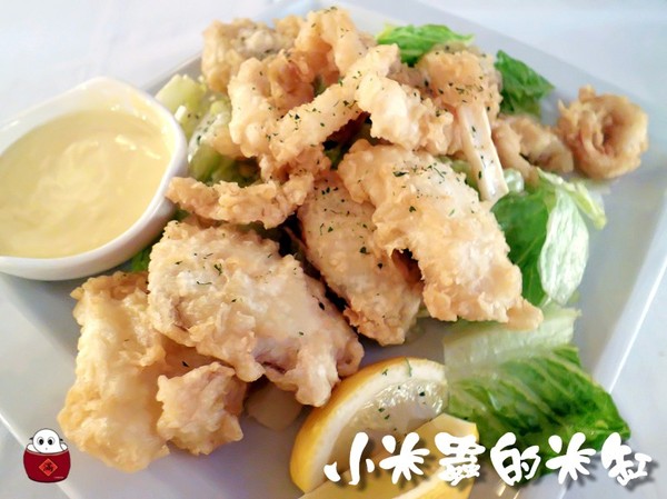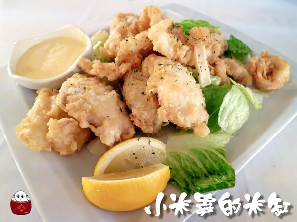 義式炸海鮮有炸花枝圈、炸蚵仔、跟炸魚片,佐醬為芥末美乃滋