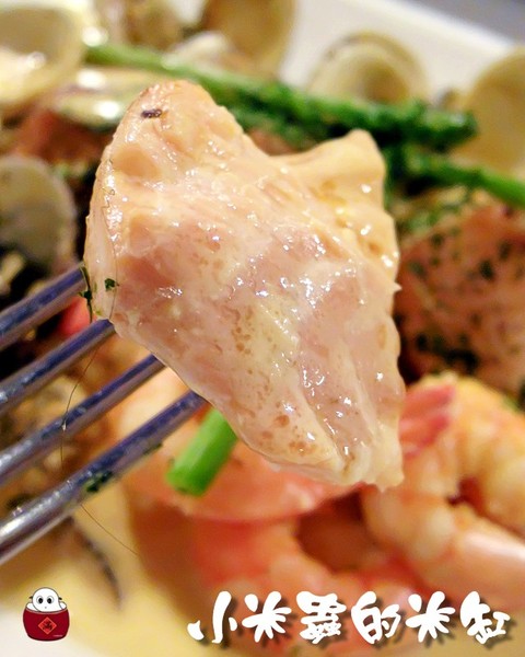 有兩大塊的鮭魚、數隻蝦子、淡菜跟為數不少的蛤俐