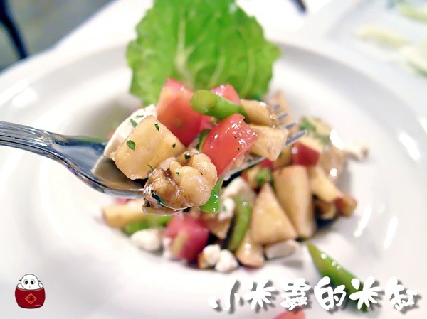 結合了蘋果丁、小番茄、核桃、蘆筍、乳酪並以美乃滋為基底的沙拉
