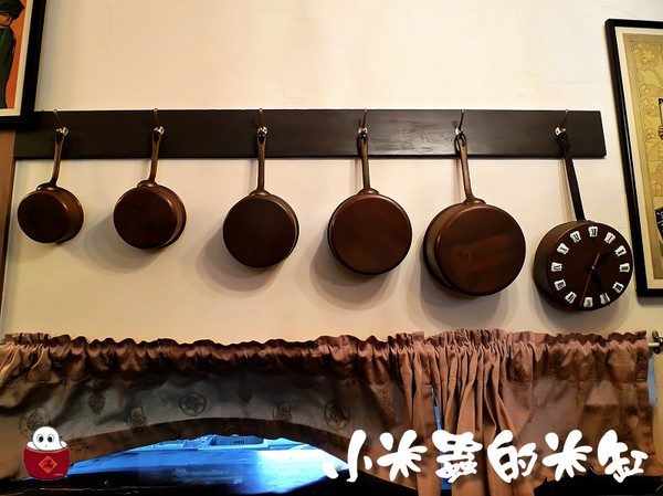 在廚房出菜口附近有排用鍋具打造的裝飾品~