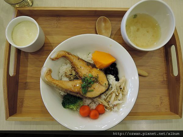Rita媽咪的鮭魚定食。選用木質托盤、餐具,搭配白色餐碗,簡單大方。