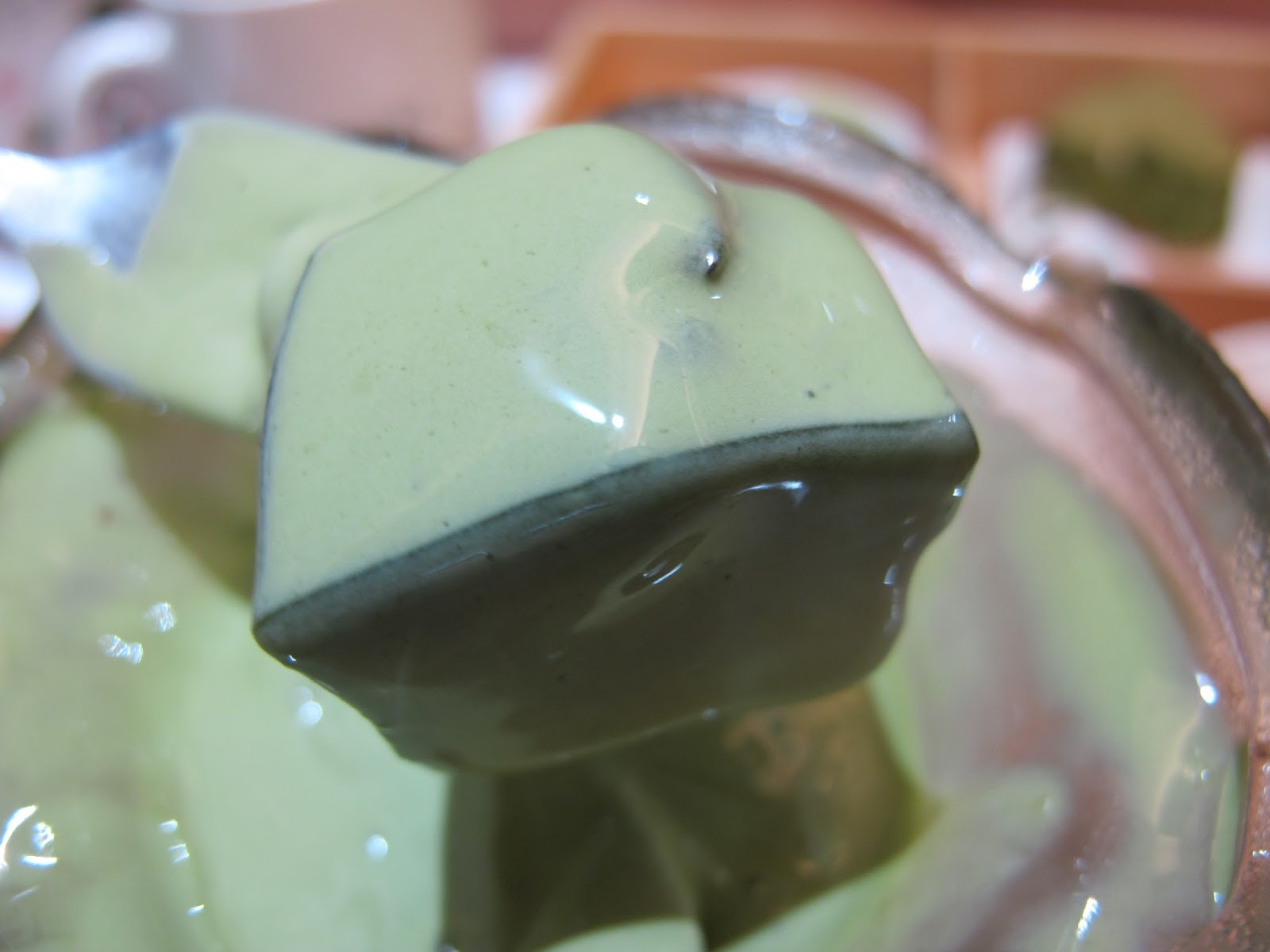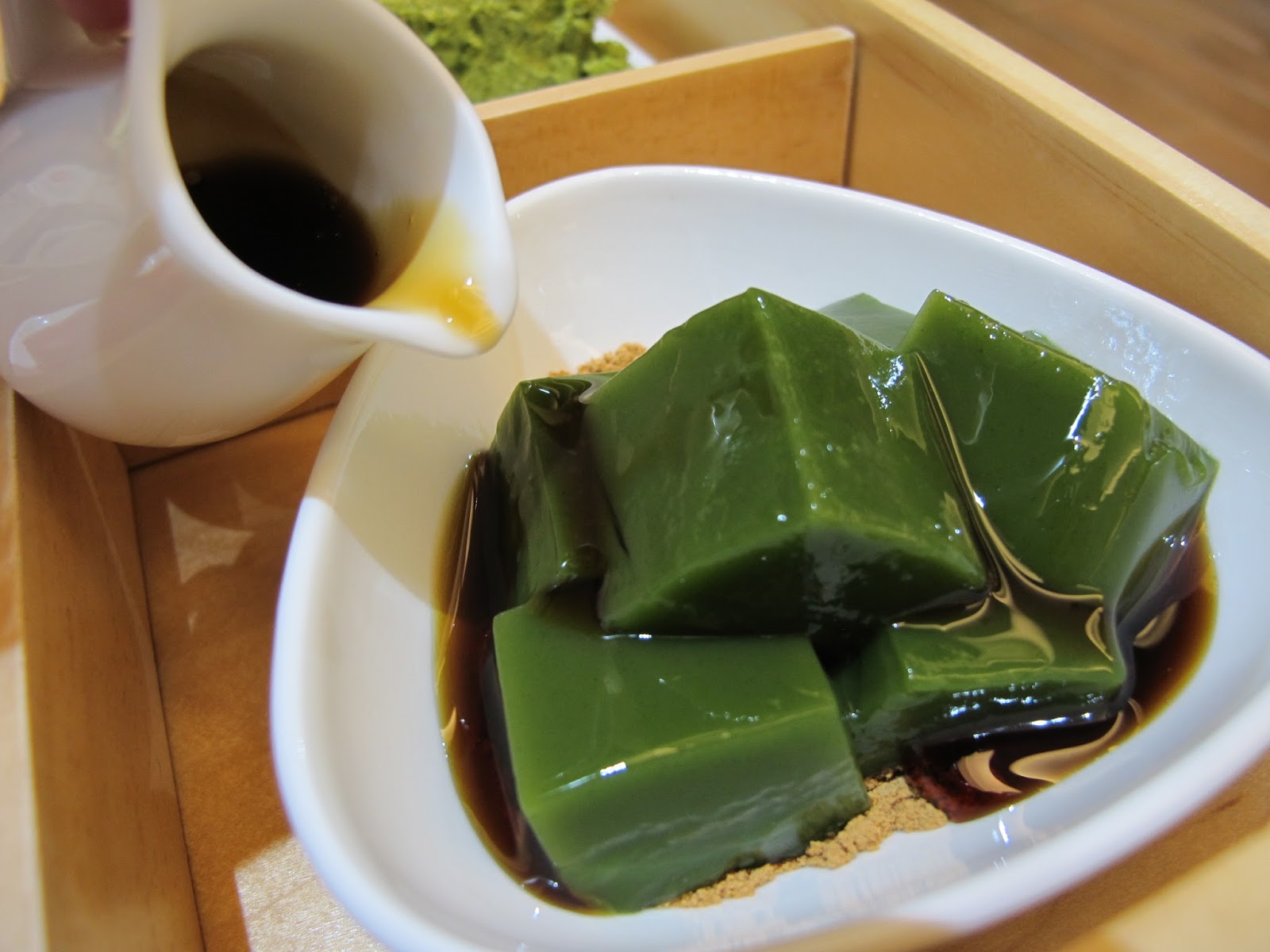 抹茶蕨餅冰涼爽口,底下襯著黃豆粉,淋上旁邊的黑糖蜜後,冰涼甜嫩的蕨餅,讓人一口接一口,停不下來!