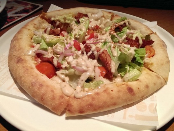 第一次看到披薩上面直接加上凱薩生菜沙拉?!!