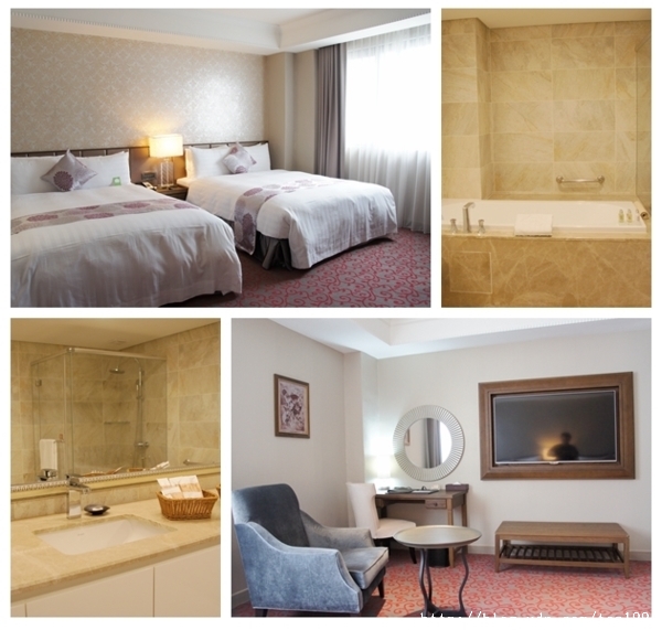 一是佔地20坪的景觀家庭套房,內部動向和住宅相同,一入門是客廳兼辦公桌,視野寬闊,採光充足,還可以看火車看到滿足;通道旁是大型衛浴設備,泡澡缸、淋浴乾濕分離,很舒適;過了通道,房間有兩張加人尺碼雙人床,這一間價格不菲,可是,和台北同價位飯店比起來,贏在空間大,光線充足,視野佳。