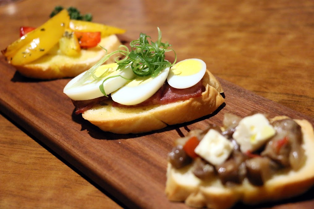 肉醬蘆筍、培根水煮蛋、鮪魚醬酸豆、茄子佐費塔起司