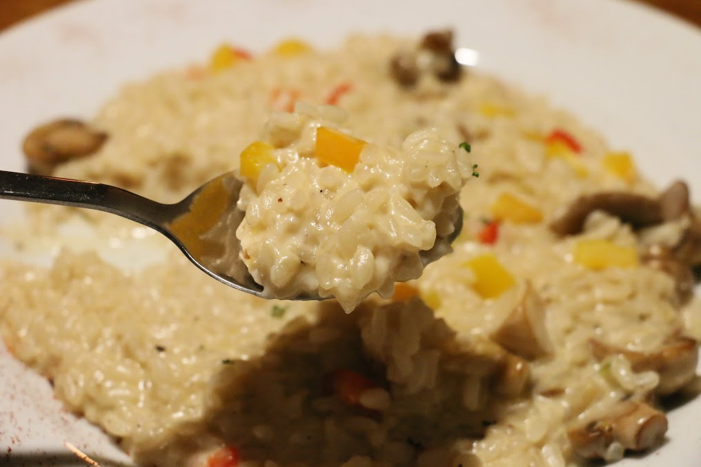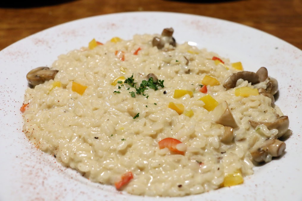 燉飯裡頭有磨菇及紅黃甜椒