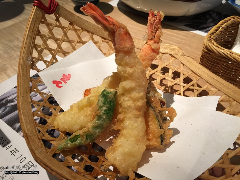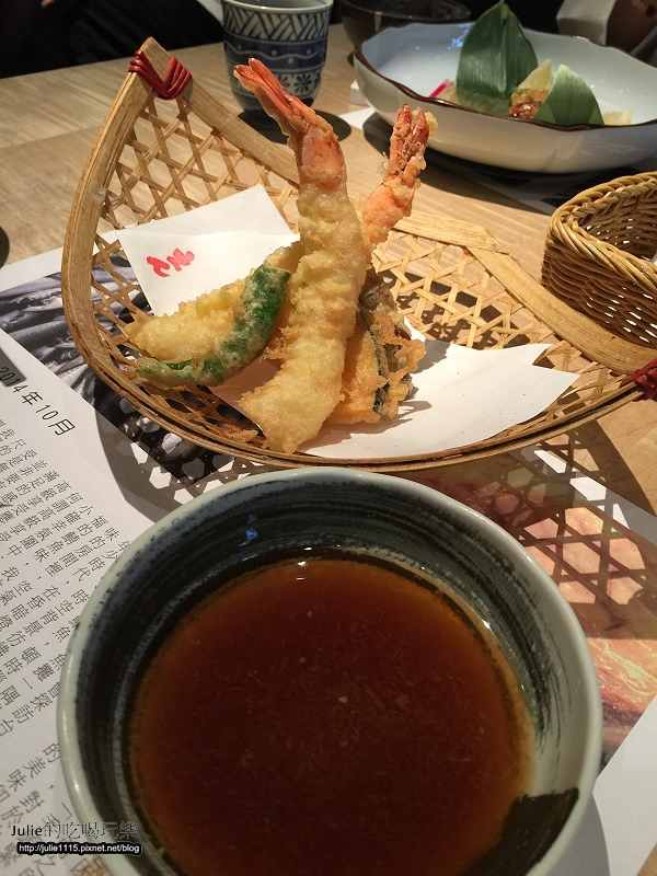 ↑有兩隻炸蝦搭配當季野菜,搭配天婦羅醬汁一起吃,現炸的熱呼呼天婦羅真的很好吃唷!