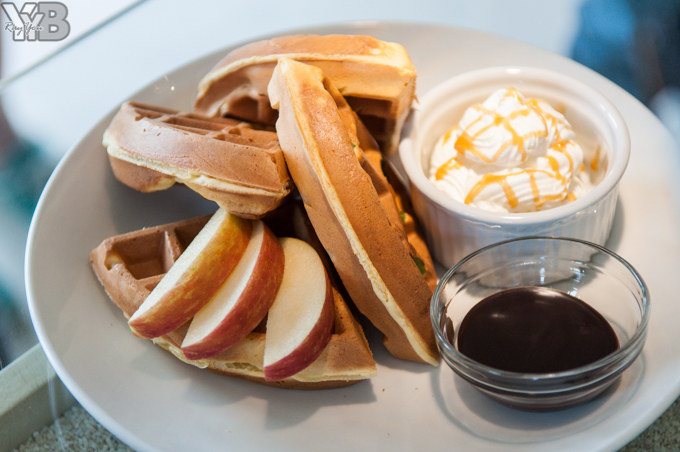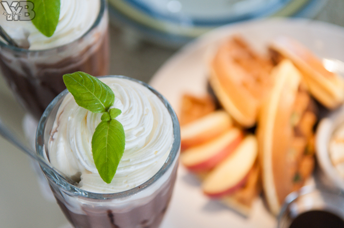 加了水薄荷鬆餅烤到外皮相當酥脆好吃,另外還有鮮奶油和巧克力醬可以搭配一起享用~