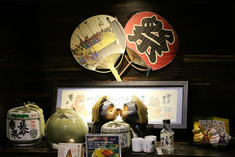 走入油花炭火燒肉專門店 門口一進來就看到這隻頭戴斗笠 手拿酒瓶的圓滾滾可愛狸貓 名自稱作開運福貍