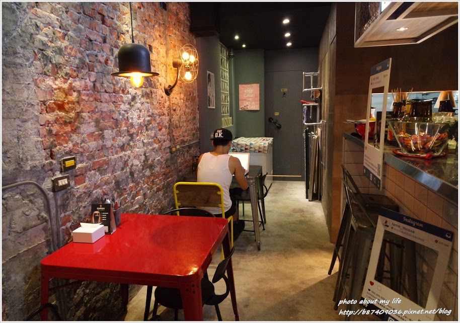 進門第一眼的感覺...紅磚牆、奇形各異的燈罩、鐵窗框做成的吊櫃、水泥地 新潮又Fashion