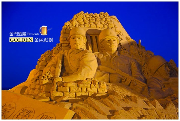 | | 金門以戰地史蹟著名… 所以沙雕堡術幾乎都是以戰史有關的題材來做創作… 而這時的天色也漸漸昏暗了下來… 深藍色的天空更顯得沙堡藝術的精緻和美感… |