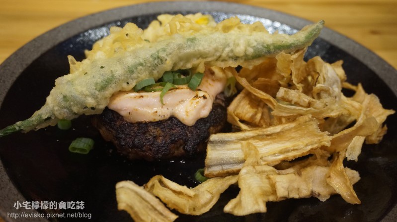 漢堡排上是滿滿的明太子醬,搭配上炸牛蒡、炸糯米椒,是非常簡單卻很日式的搭配。