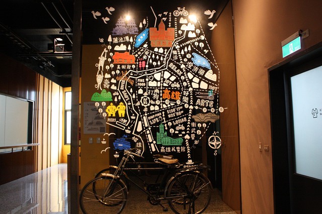 旁邊有高雄景點藝術擺設和一台復古腳踏車,但是不是給客人試騎的。
