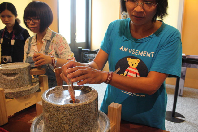 由紅頂穀創穀物文創樂園穀樂坊工作人員先做示範,告訴孩子要如何磨穀物,