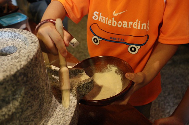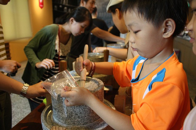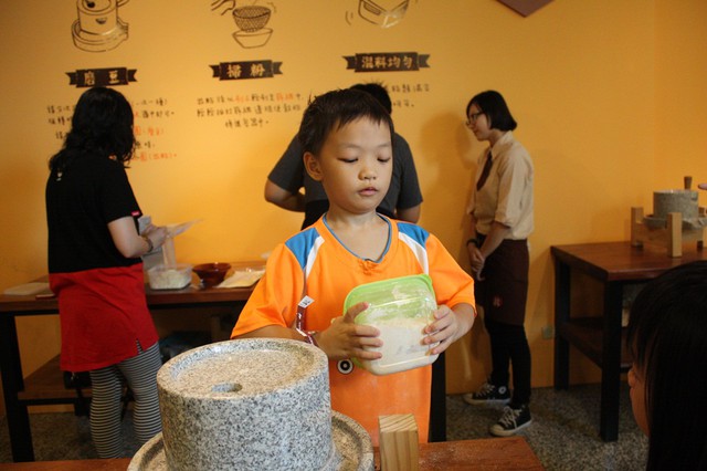 這是和我一同前來的朋友和小朋友,他們聽完指導人員的示範說明也開始倒入穀物。