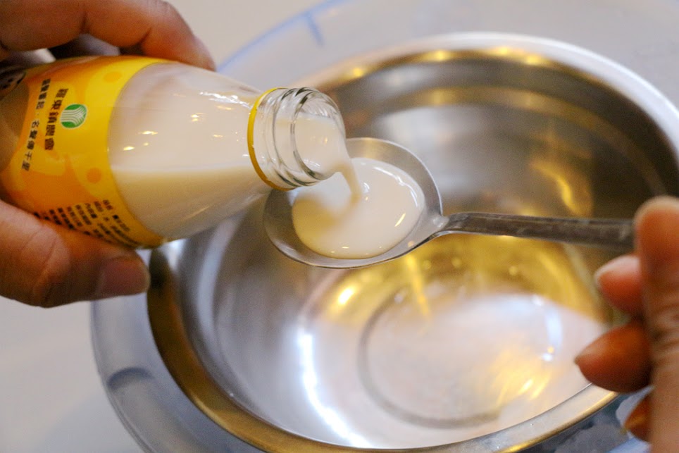 然後倒入豆奶一湯匙